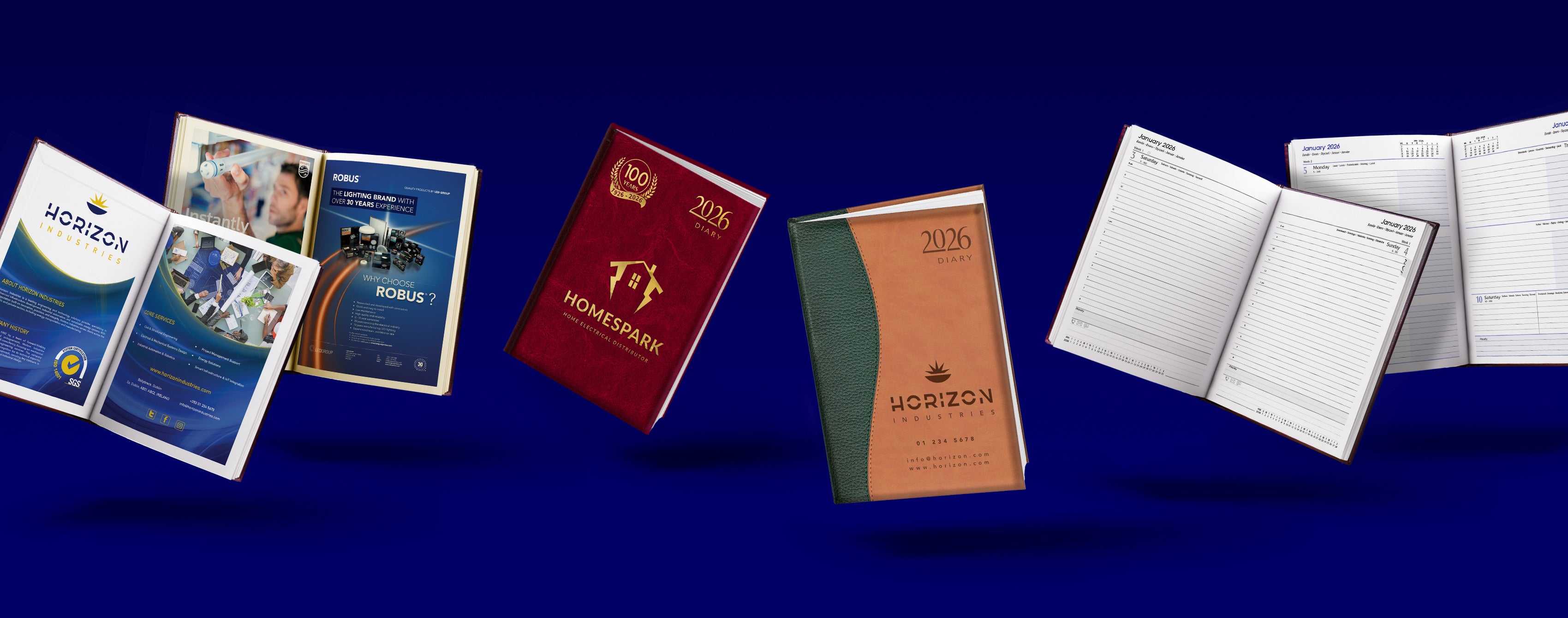 Our hassle-free and easy design service allows you to create promotional merchandise by simply adding your logo and details to our diary, notebook and calendar products.