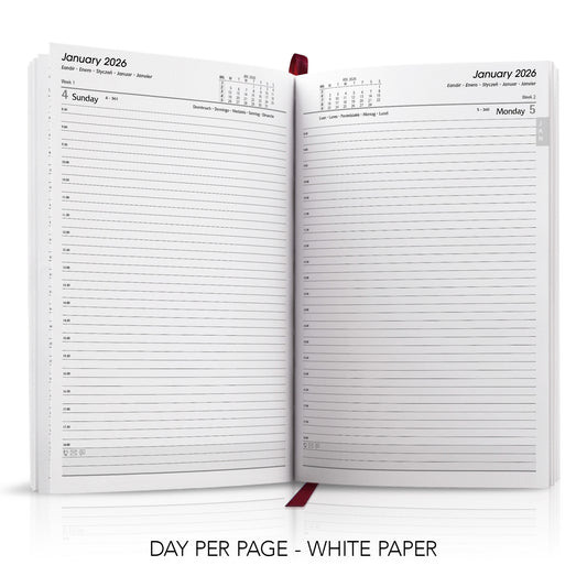 The traditional A4-sized desk diary offers a larger, more practical format for writing or laying flat on a desk compared to smaller diaries. Its Day Per Page layout provides ample space for detailed entries, while the sizeable pages allow for prominent display of your company's branding and other important details.