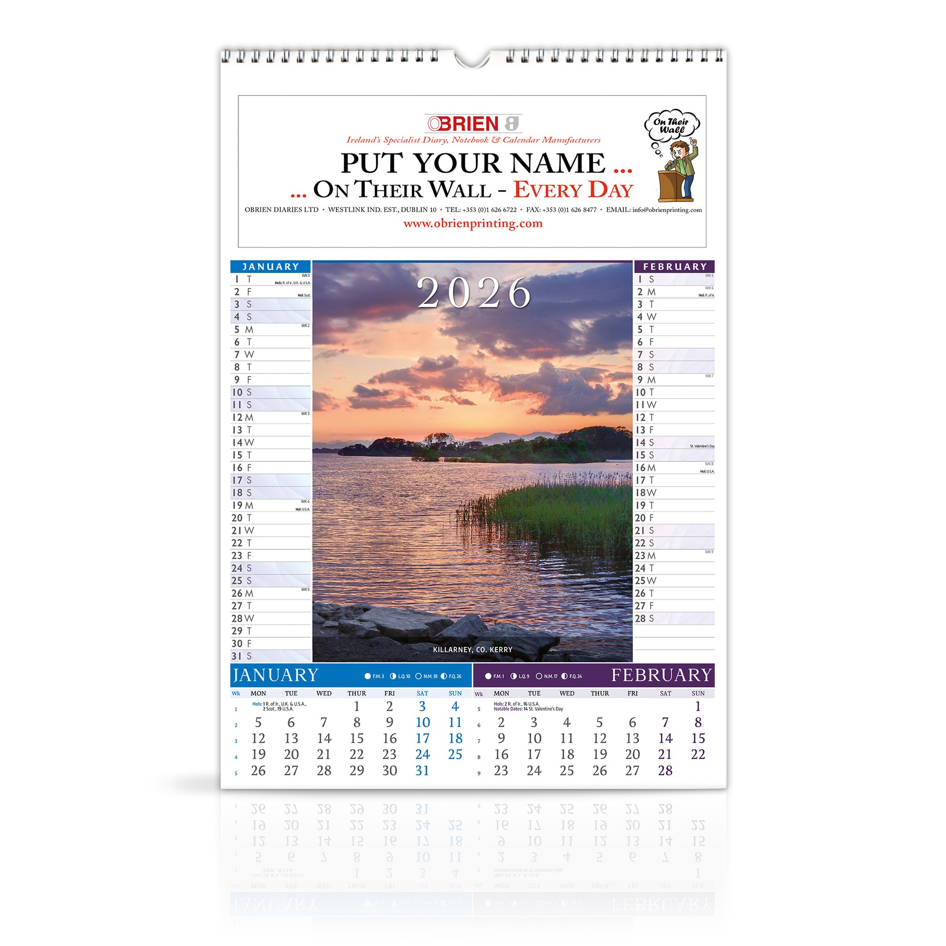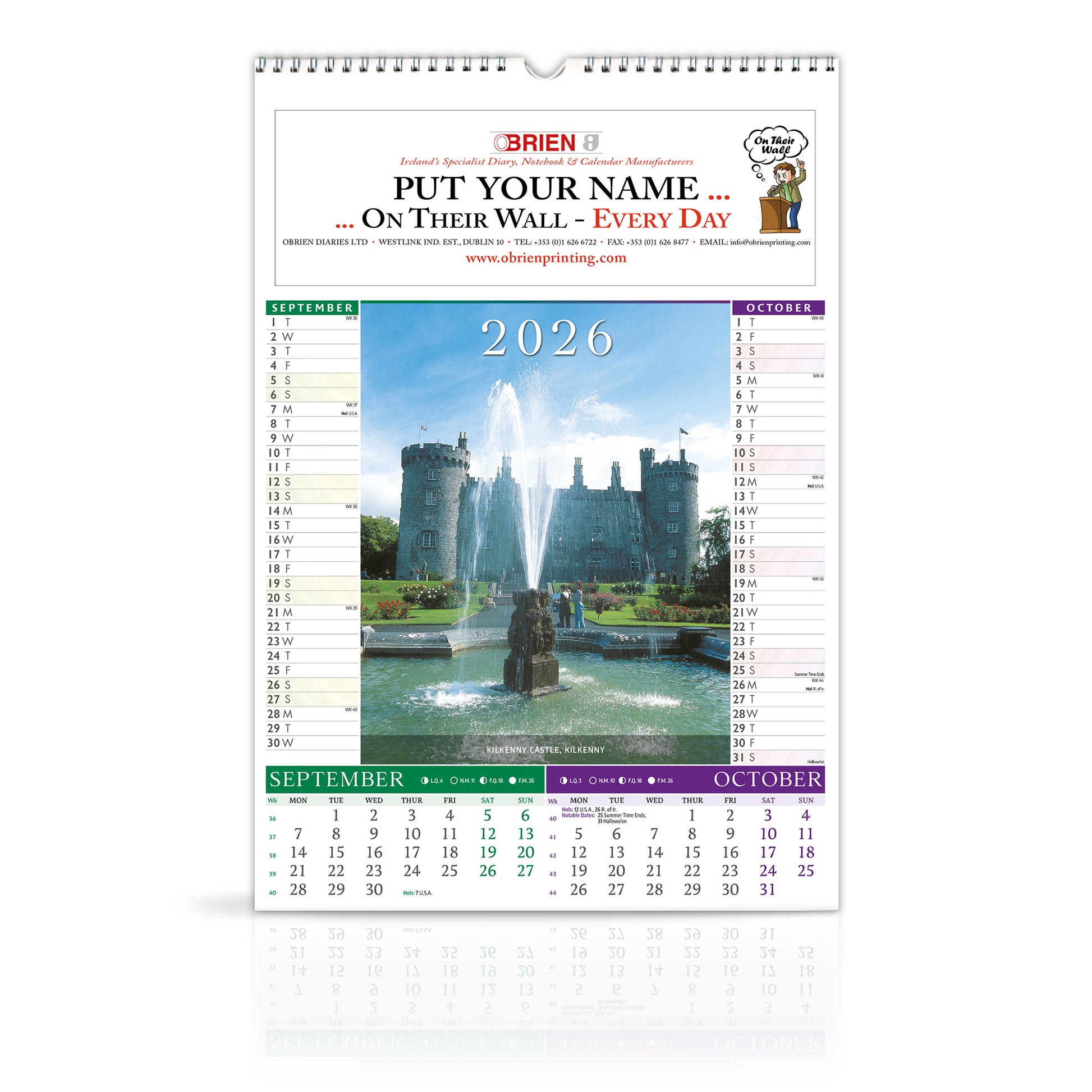 Modern, colourful and popular, featuring 6 pages of two months per page. This wirebound calendar is suited for SME’s & Irish Exporters alike.